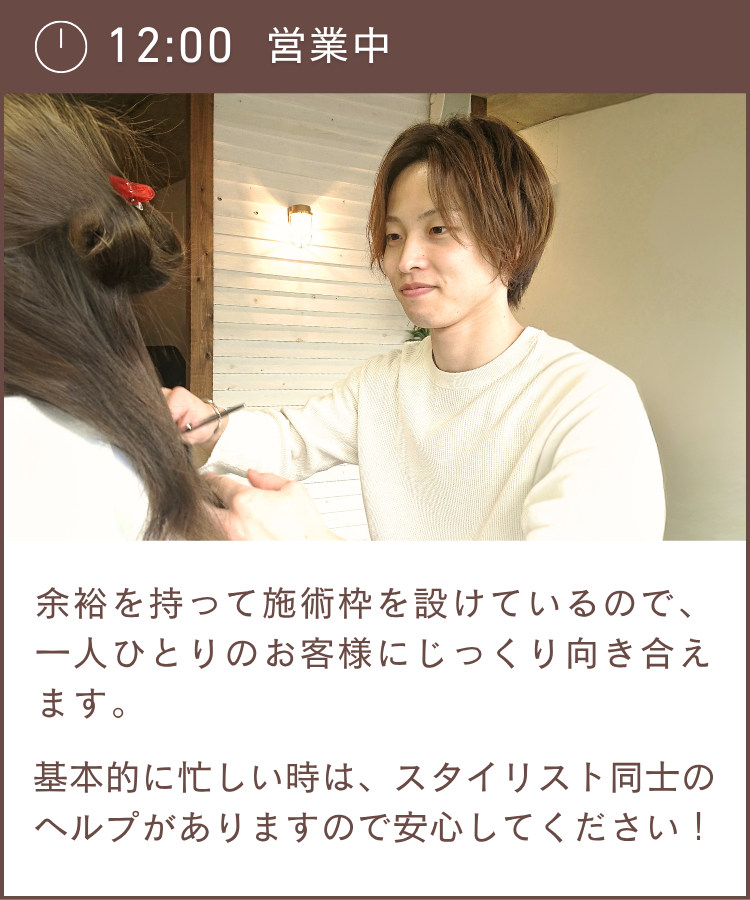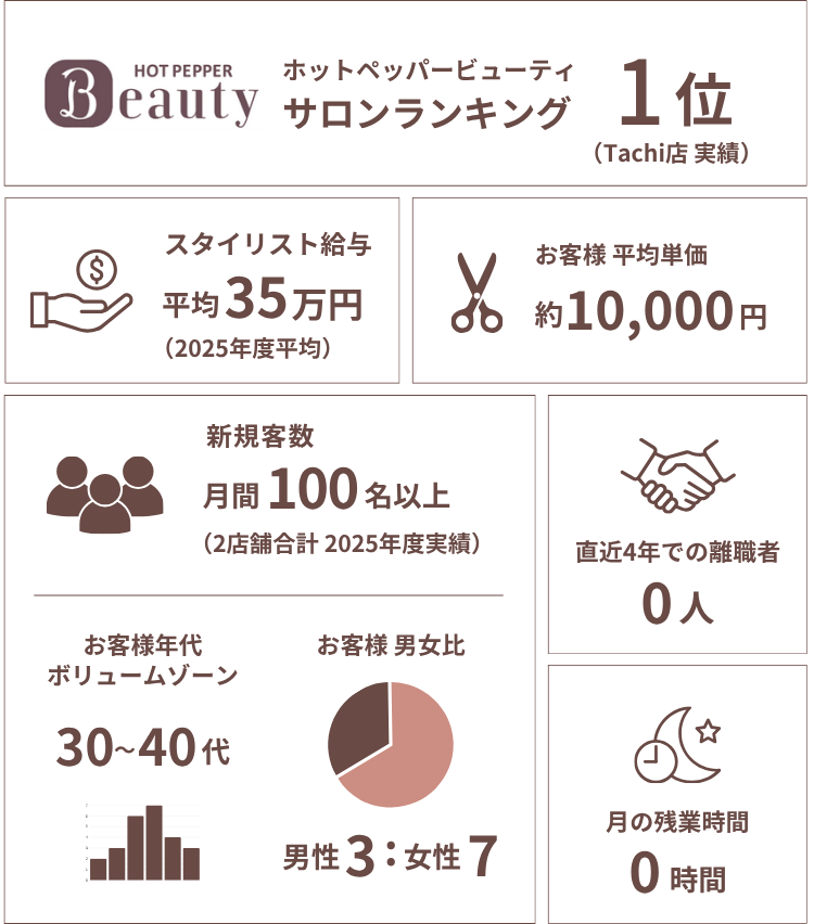 【スタイリスト】 最低保証月給250,000円以上+ 歩合+手当 ※相談の上、前職より評価 幹部候補の場合270,000円~ 売上60万円以上より売上の40%歩合還元(新規、フリー含む) 例: スタイリスト2年 売上100万円(指名・フリー合計) 給与400,000円+諸手当 【パート】 時給ご相談 6カ月間は試用期間になります(条件同じ) |